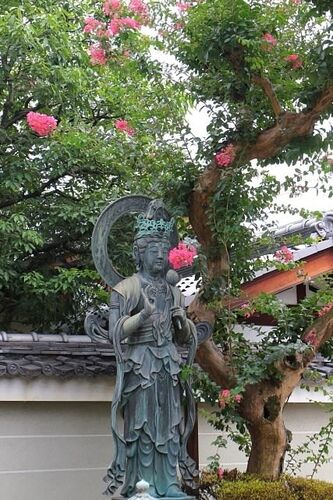 お盆もあっという間に終わり今日はもう送り火の日です(KBS京都で生中継)高倉五条下がるの「宗仙寺」さん、菩薩像の傍らで百日紅の花が咲いていました。観光寺院ではありませんが市内では珍しい曹洞宗のお寺江戸時代に永平寺に代わり宮中に参内した京洛中三…