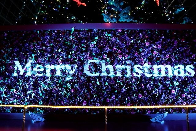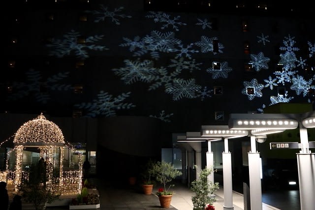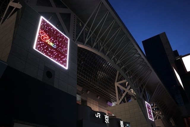 2019-12-24 京都・駅ビル「クリスマスツリー」東広場から 京都(祭・行事) 京都駅ビルコンコース、東広場から見る室町小路広場の巨大ツリー東広場では今年から新たに光の演出が一新され、ビルの壁面にはジェクションマッピングが映し出されています。 室町小路広場の大階段ではグラフィカルイルミネーションplusも開催空中回廊から見る大階段駅ビル10階では東広場と室町小路広場を空中回廊で行き来できます。回廊も今年は新たにライトアップされ白い光から赤や緑のクリスマスカラーに変わります。 昼間のビックツリーも緑が映えて違った趣。