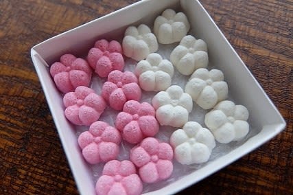 2017-06-01 京都・三条会商店街「三条若狭屋」らむね 京都(和菓子・洋菓子) 明治26年(西暦1893年)創業の京菓匠「三条若狭屋」さん、三条会商店街の東角の趣ある建物が印象的若狭高浜出身の本家若狭屋さんから別家したため”若狭”の名が残されているようです。祇園祭の稚児のお世話をしていた二代目さんが考案した『稚児餅』が看板商品店内は生菓子の販売もありカフェコーナーも併設。 かわいい梅の形をしたお菓子は落雁ではなく和菓子屋さんでは珍しい『らむね』1つ1つ手作りで季節限定の味もあります。赤いのは紫芋白い方はかぼちゃ品の良いはんなりとした甘さです。